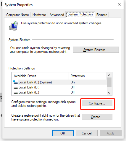 Step 2. Subsequently, select the system drive and click on Configure within System Properties.
