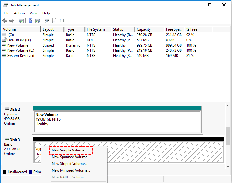 Step 8. Right-click the initialized disk and click New Simple Volume to create a new one. Remember to select FAT32 or NTFS as file system.