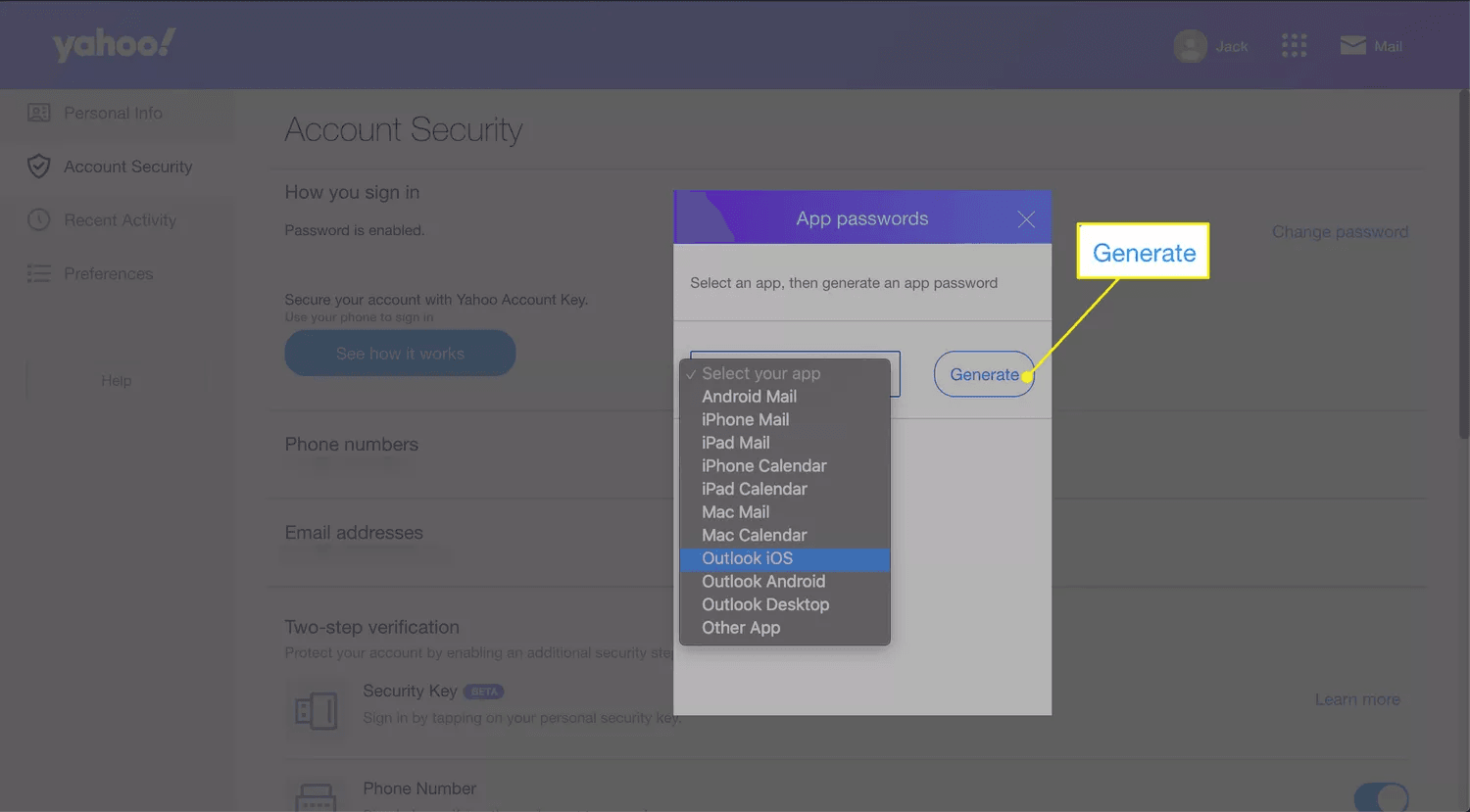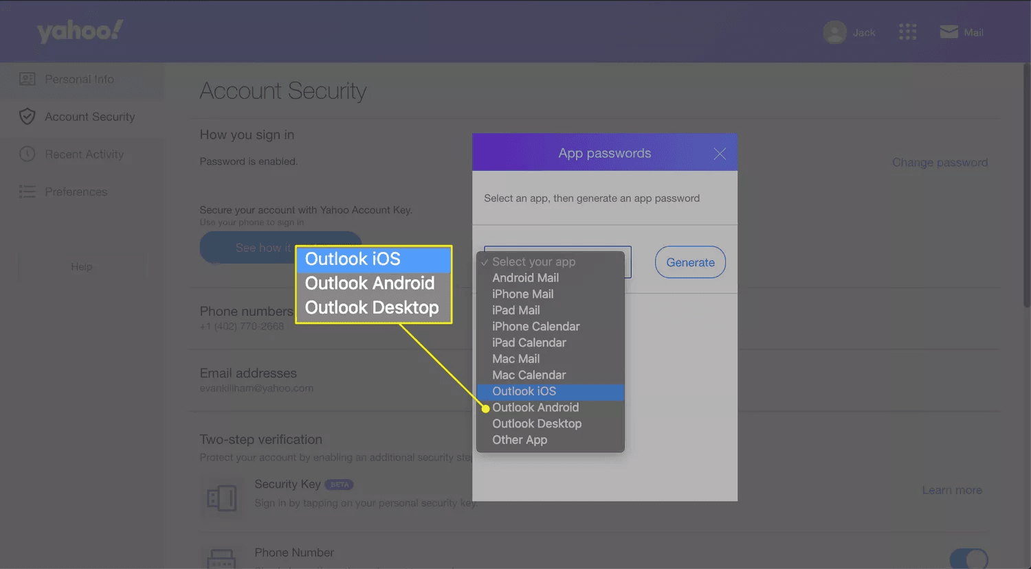 If you have two-step verification enabled: To proceed, generate a third-party app password. This password will be used instead of your regular Yahoo Mail sign-in password when setting up Outlook.