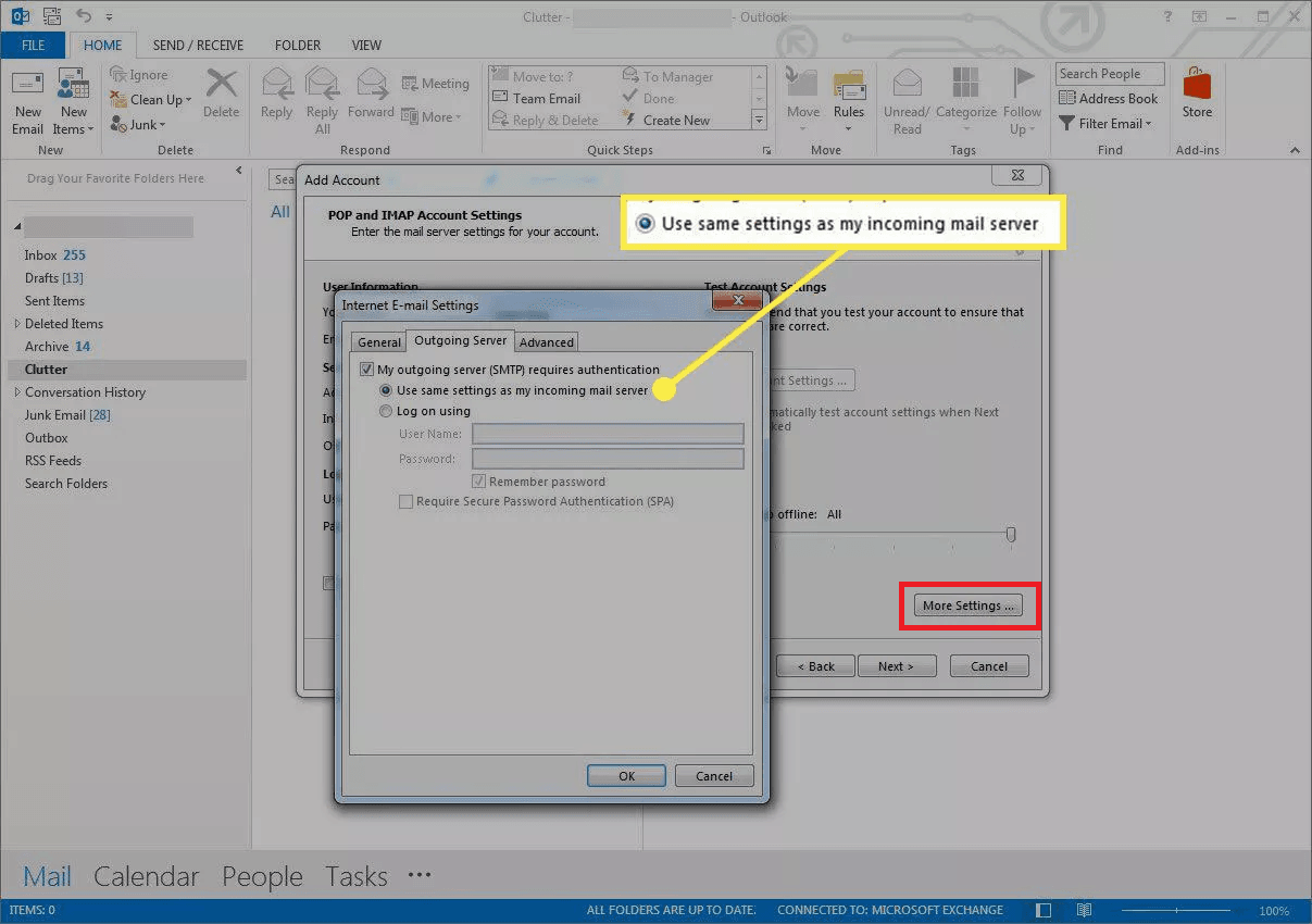 Step 8. Click on More Settings and navigate to the Outgoing Server tab. Check the box that says My outgoing server (SMTP) requires authentication and select the option Use the same settings as my incoming mail server.