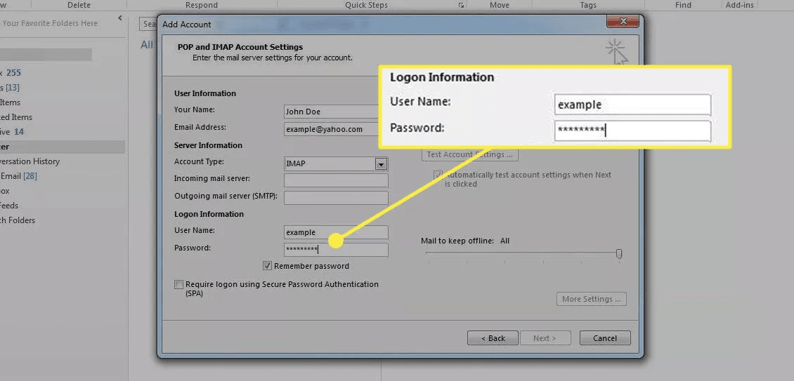 Step 7. In the Login Information section, the User Name text box will show your Yahoo Mail address's user name. Please verify and update this information if needed. Next, navigate to the Password text box and input the app password you generated, if your account has two-step verification enabled.