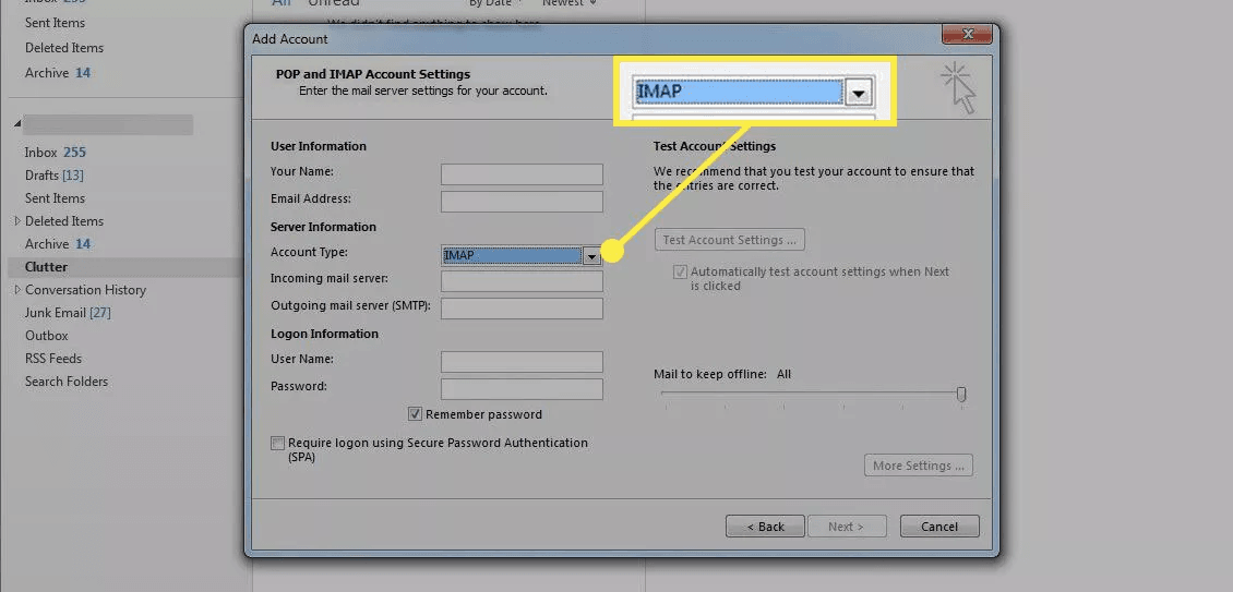 Step 4. In the Server Information section, click on the drop-down arrow next to Account Type and select IMAP.