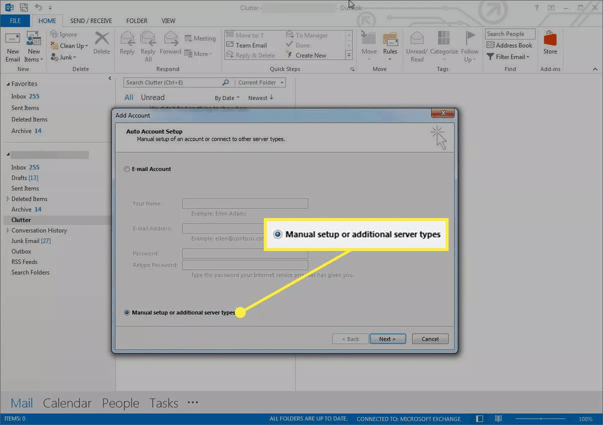 Note: For Outlook 2010, select Manually configure server settings or additional server types.