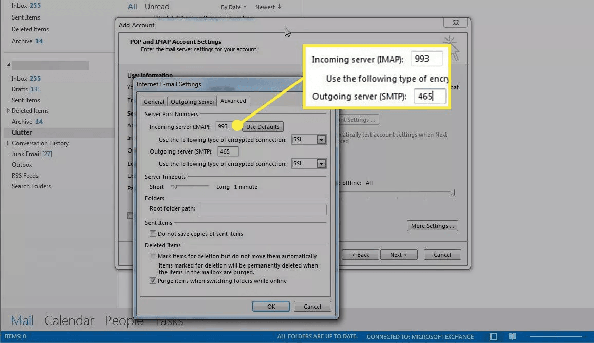 Step 9. Navigate to the Advanced tab. For both the Incoming server (IMAP) and Outgoing server (SMTP), click on the drop-down arrow next to Use the following type of encrypted connection and select SSL.