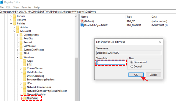 - Name the new key “DisableFileSyncNGSC”. Then, double-click the newly created DWORD and change the Value data to 0 and click OK to save changes.