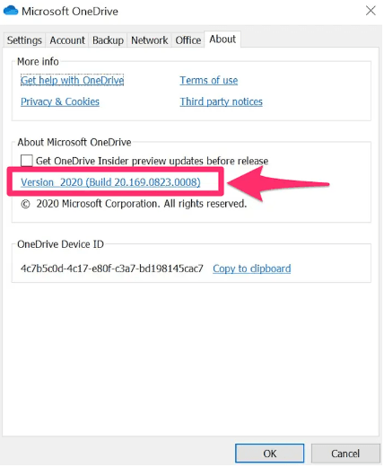 - Click the "About" tab. In the "About Microsoft OneDrive" section, click the version number link.