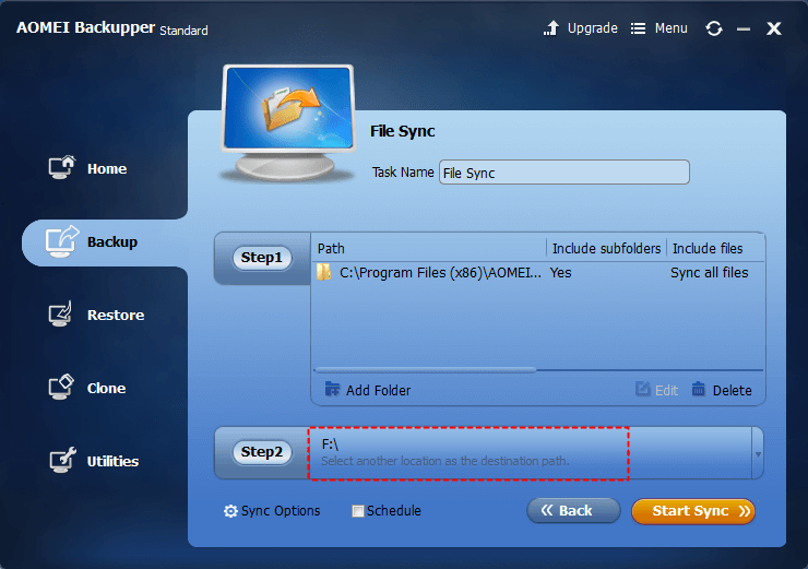 Follow the steps below to sync files from one location to another via AOMEI Backupper: