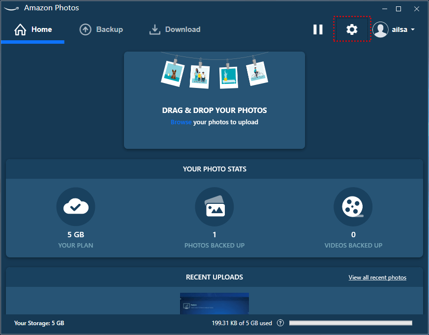 1. Open Amazon Photos interface, click Settings icon at the top right corner to go to Preferences.