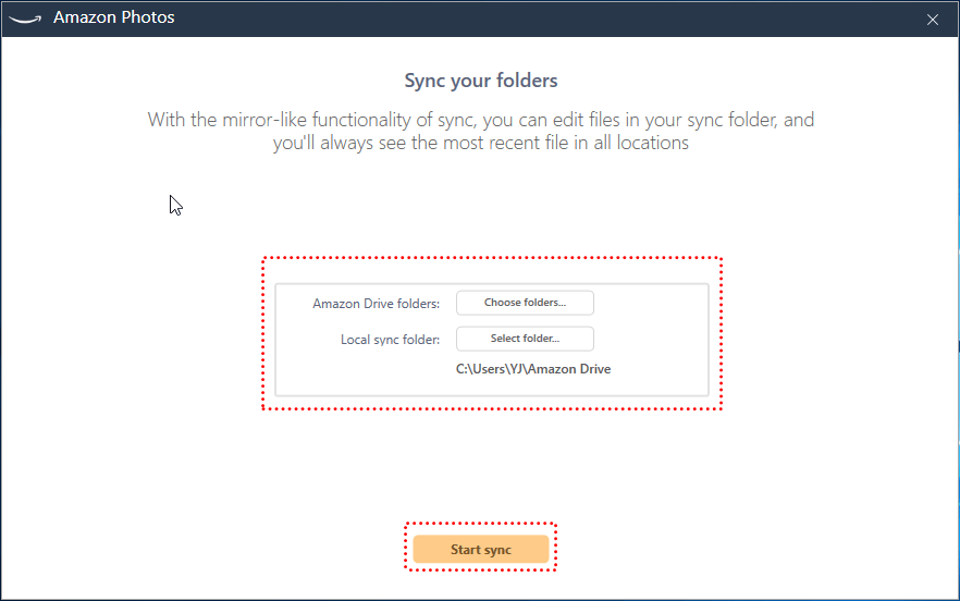 3. And the Amazon Photos will restart and your desktop will get Amazon Drive shortcut for you to sync. Amazon Photos will inform you to choose Amazon Drive Folder to save the sync files, and select Local Sync Folder (by default, it’s located in C:/Users/Your username/Amazon Drive if you not modify the location), press Start sync button.