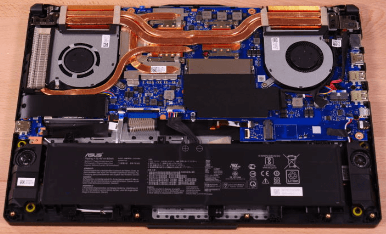 As for the SSD, the ASUS TUF A15 comes with two M. 2 slots for SSDs, one of which is pre-installed with a drive. The empty slot is located in the bottom-right corner of the motherboard, just above the battery. The other slot, which has a pre-installed SSD, is in the upper left of the motherboard, closer to the laptop’s cooling module.