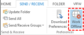 Also, if the Outlook app is offline, showing “Disconnected” or “Trying to Connect” status, you need to switch to working online. Click Send/ Receive and Work Offline.
