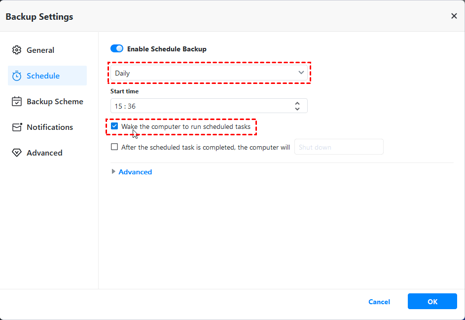 - Enable Daily, Weekly, or Monthly schedule backup and be sure the option Wake the computer to run scheduled task is checked.