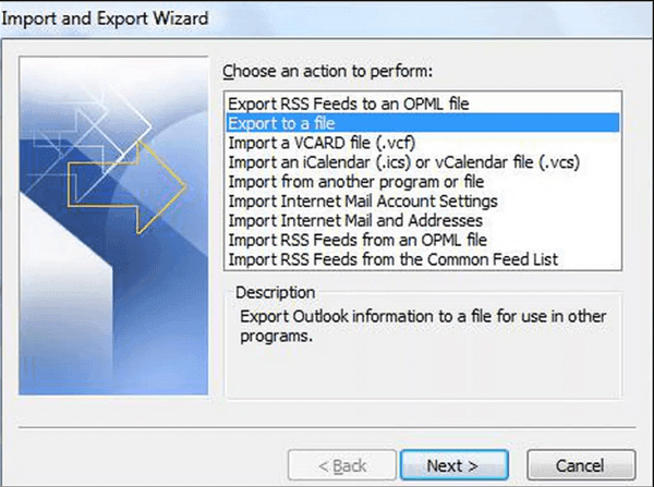 2. Continue Export to File > Next > Outlook Data File (.pst) > Next.