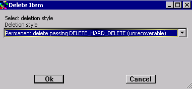 1. Select Permanent delete passing DELETE_HARD_DELETE (unrecoverable) under Deletion style in the Delete Item dialog box. Then, select OK.