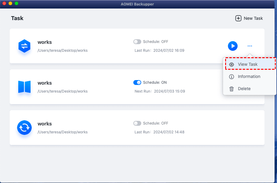 Step 1. Install and launch AOMEI Backupper Mac. In the main interface, click New Task in the top-right corner.