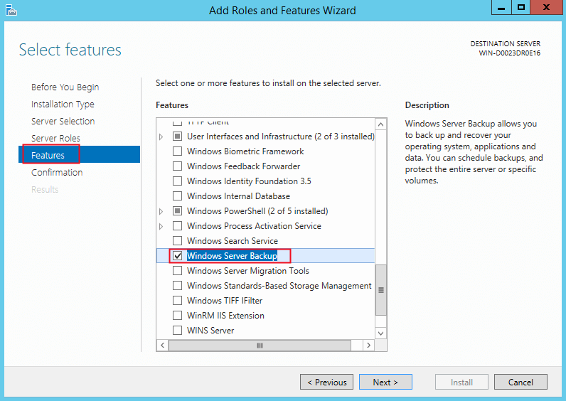 1. The Windows Server Backup is not installed by default, so you need to install it on your selected computer with the steps: Go to Server Manager -> Dashboard -> Manage -> Add Roles and Features, and then follow the wizards to install.