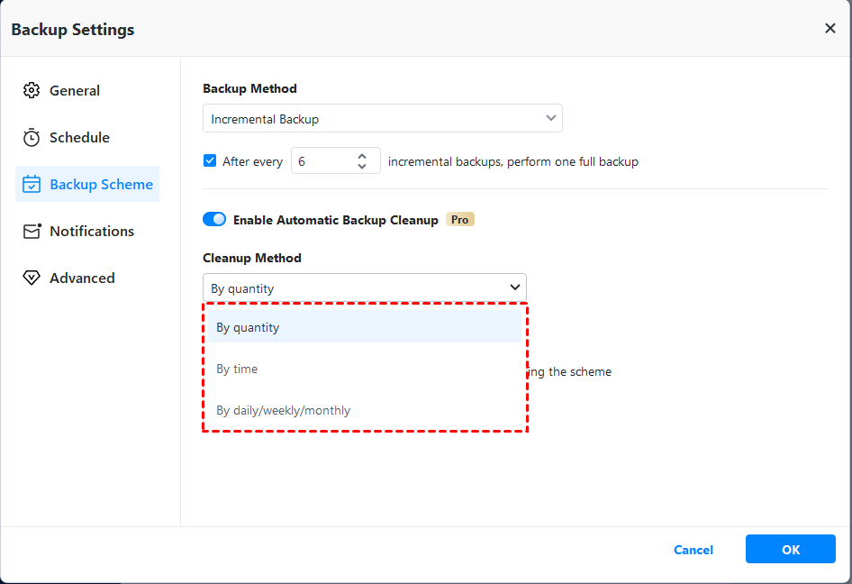 By default, this software will run Incremental Backup together with the schedule backup task. Although it saves a lot of time and disk space, the backup disk may be fulfilled as well due to limited space.