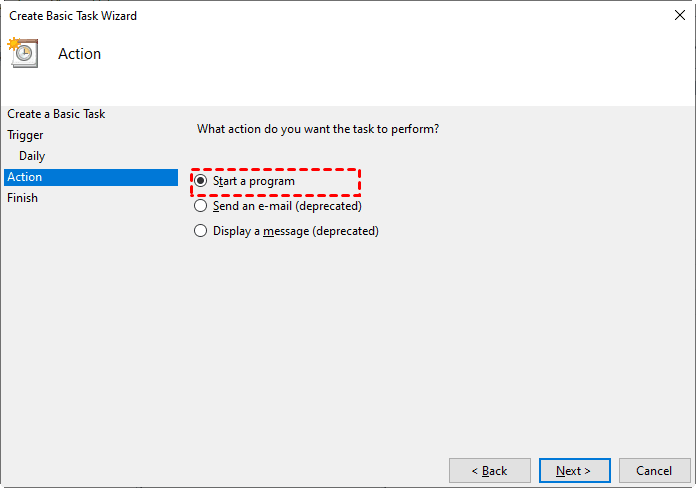 3. Choose Start a program and browse your PC to select the .bat file.