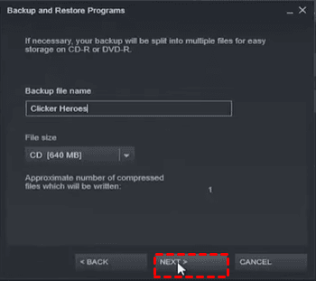 Step 5. Specify the backup file name and size for the media you're using. Click Next to begin the process.