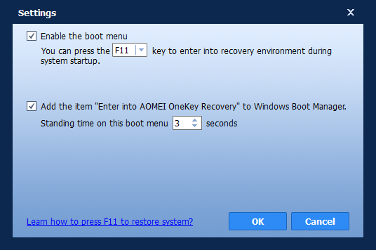 Step 4. Click Start Backup to create a factory image for your computer. The boot menu will be added to your system automatically when the backup is complete. You can then specify fast recovery key F11 or A to enter this software as well as the standing time for it.