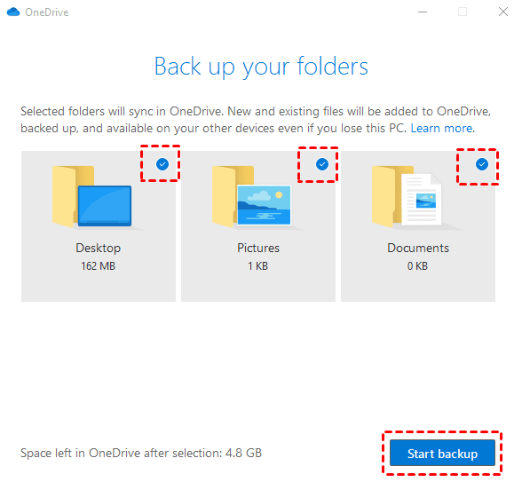 Step 5. Then, OneDrive will display the Manage folder backup screen. Select the files you want to back up - the Desktop. If you need, you can also backup documents, pictures, etc.