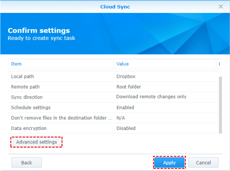 When it comes to backing up Dropbox files to Synology NAS, you may first think of an official program. Yes, Synology provides an application called Cloud Sync to help users sync files between Synology NAS and public cloud services. You are allowed to perform Synology bidirectional sync or one-way sync based on your needs. Follow the steps below to download files from Dropbox to Synology only: