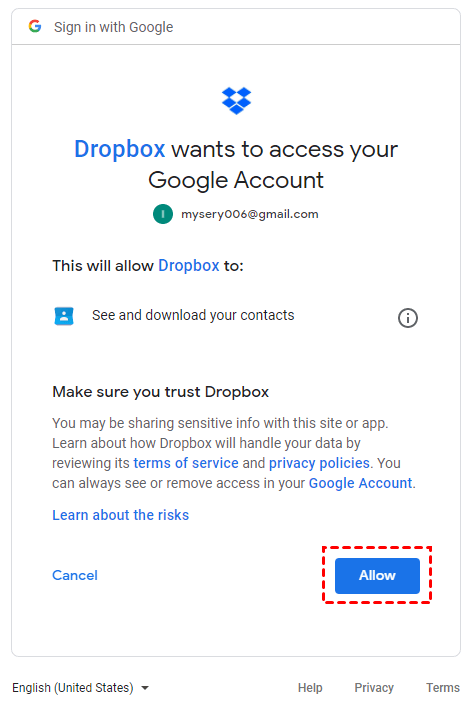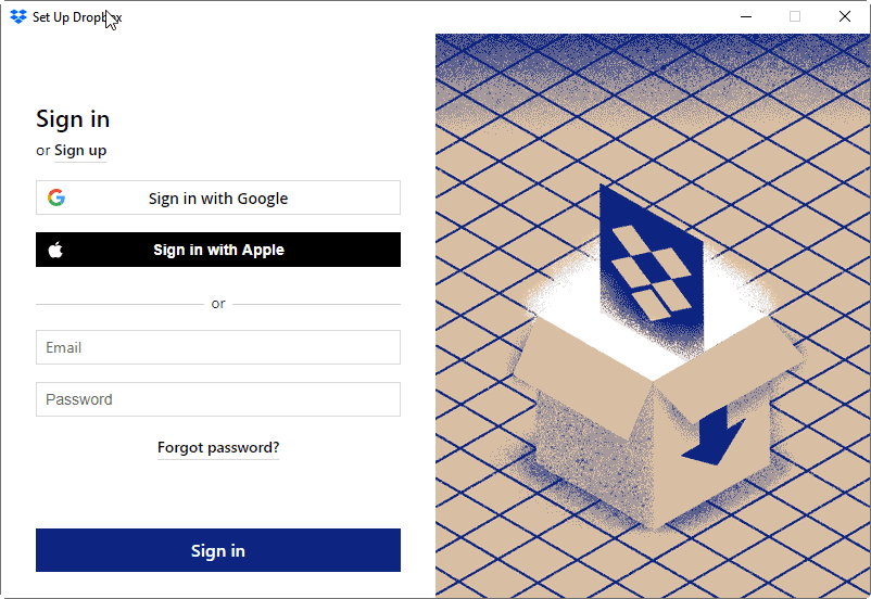 Step 2. In the Set Up Dropbox window, sign in with email and password or use other options.
