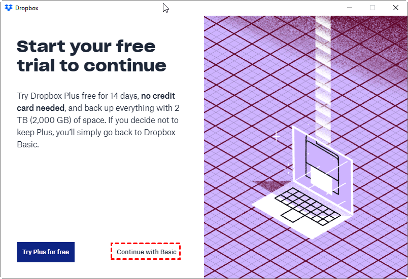 Step 7. Click Try Plus for free or Continue with Basic If you don't want to. Click Yes when you asked to confirm the option you choose. Note that the Basic account only has 2GB free space.