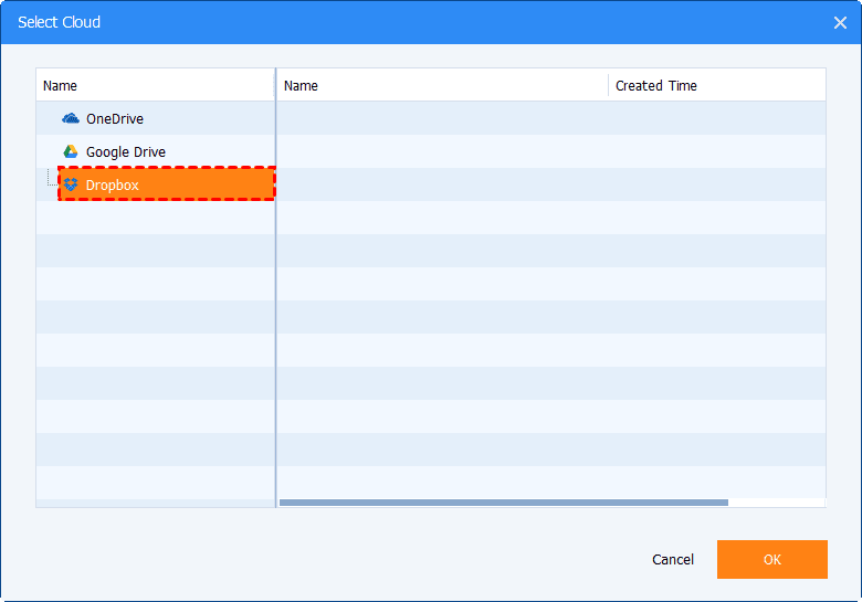 Step 4. Click the inverted triangle at the second box and Select a cloud drive. Then, you will see all the available cloud drives in the Select Cloud window, select Dropbox and click OK.