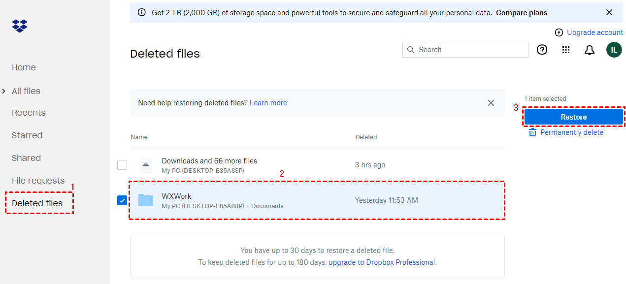 Step 8. Go to dropbox.com and select the Deleted files option. Then, select the folder containing all of your files and click Restore.