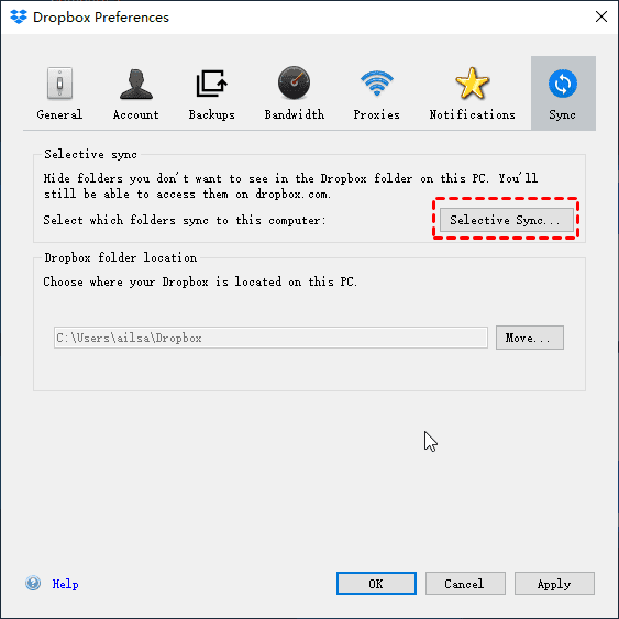 Step 9. Go to the Preferences of the Dropbox desktop app, click Sync and Selective Sync, and uncheck the retrieved folder to hide it on this computer.