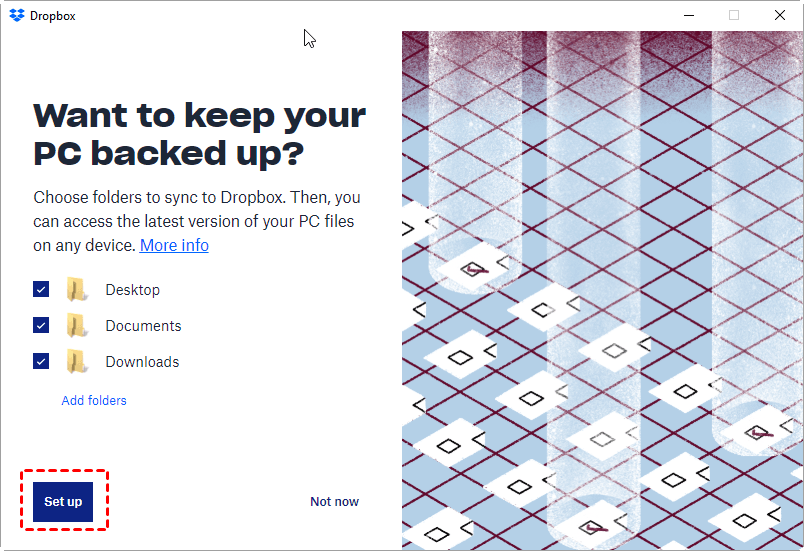 Step 6. In the Want to keep your PC backed up window, keep the default folders checked and click Setup. Also, you can add other folders by click Add folders.