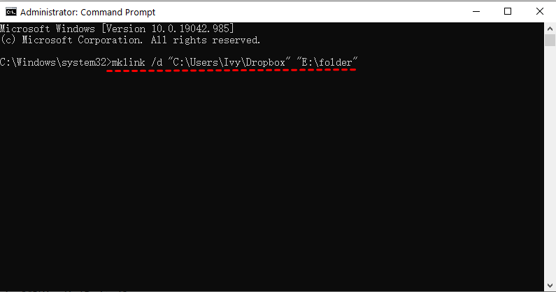 mklink /d “C:\Users\YourUserName\Documents\My Dropbox” “E:\folder”