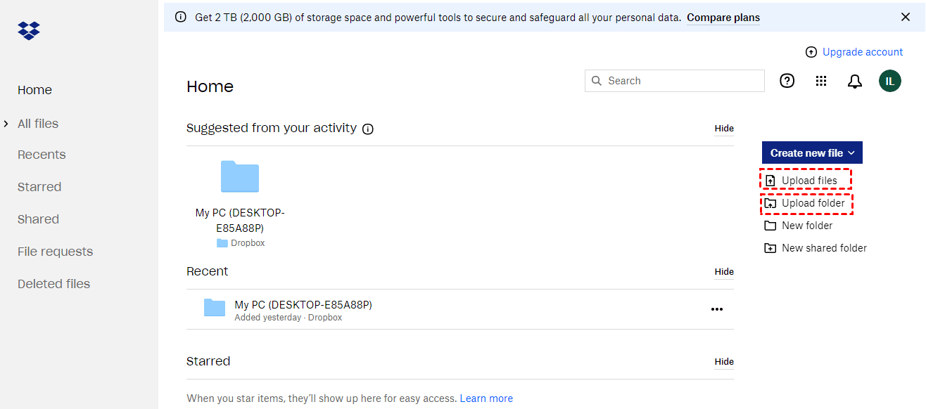 - If you want to upload files or folders using the Dropbox website, you can open dropbox.com and select Home > Upload Files or Upload Folder to choose whatever you want to backup.
