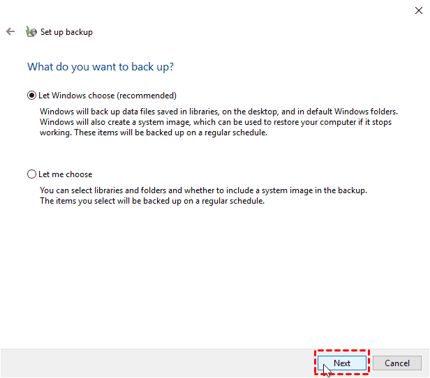 Step 5. Select Let Windows Choose option and click Next. It will backup files about users, such as files saved in libraries, on the desktop, and default Windows folders.