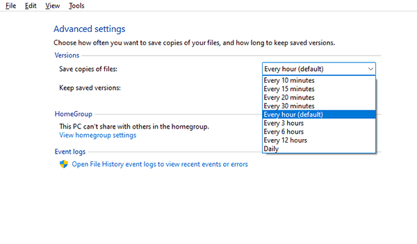 ▶ Save copies of files: By default, File History backs up your files every hour, but you can change this setting. You have the different options of doing it from 10 minutes to 24 hours.
