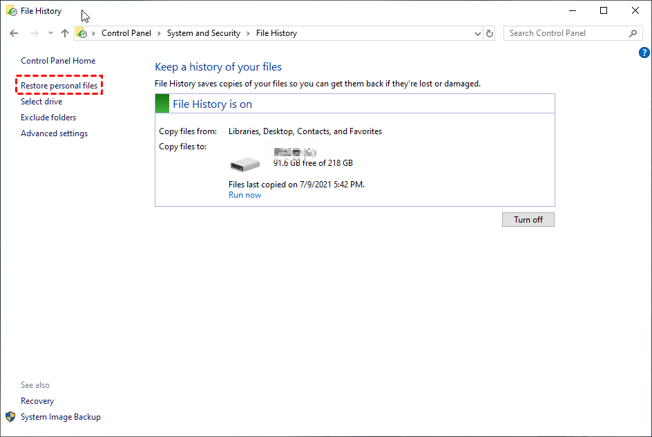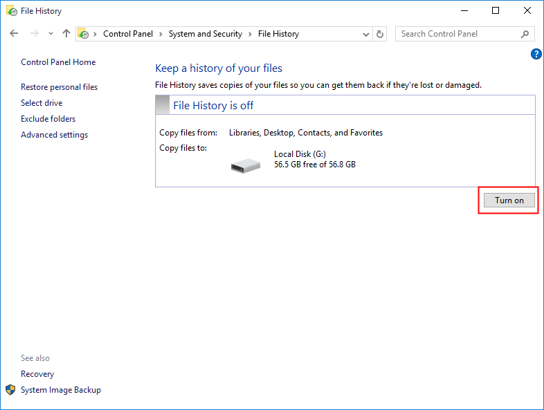 Step 2. File History will automatically select the external drive connected to your computer as the backup destination. Click Turn on to enable File History.