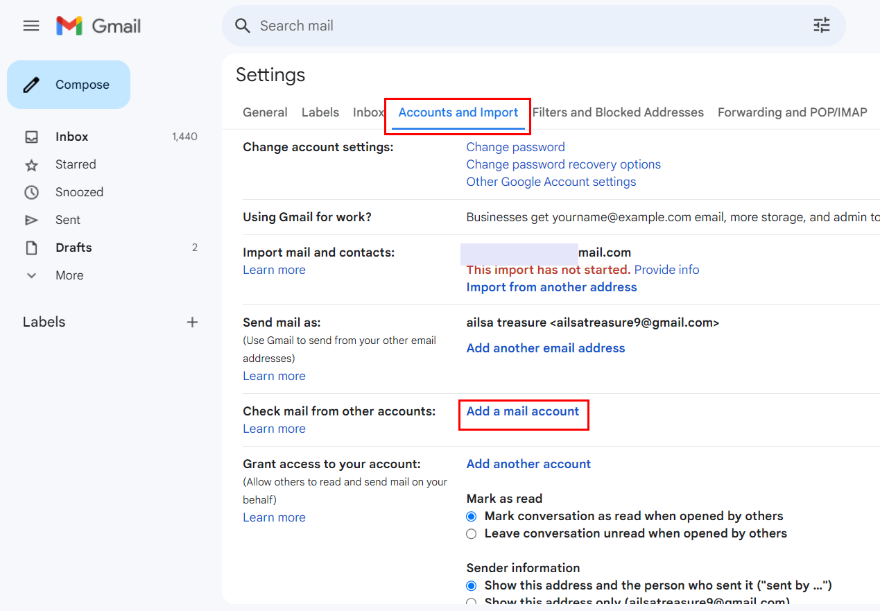 Step 3. Within the Accounts and Import tab, locate Check mail from other accounts and opt for Add a mail account.