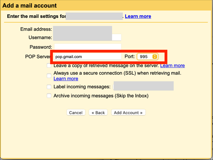 Step 7. Opt for pop.gmail.com as the POP Server and set the Port to 995, ensuring alignment with the remaining options under POP Server. Conclude by clicking Add Account.