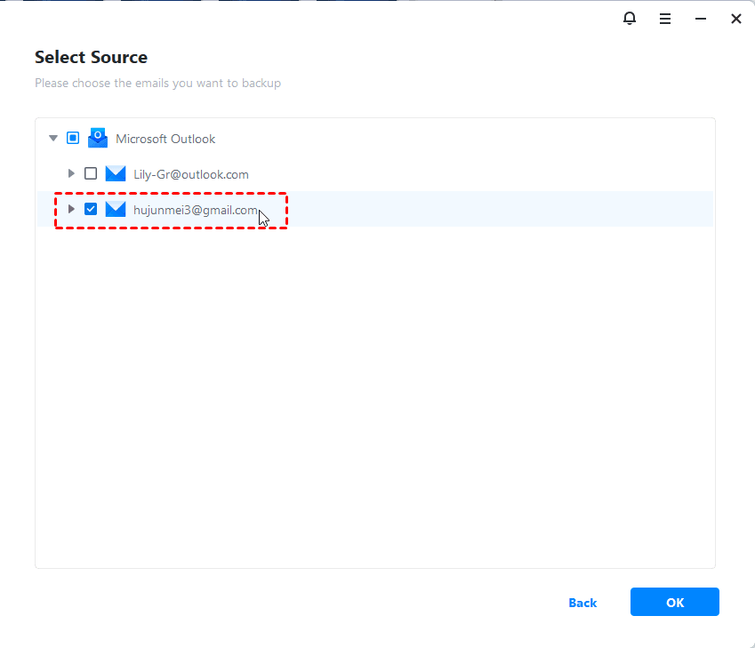 - Click Add Outlook data and select the Gmail account with the entire mailbox you want to backup. Then click OK.