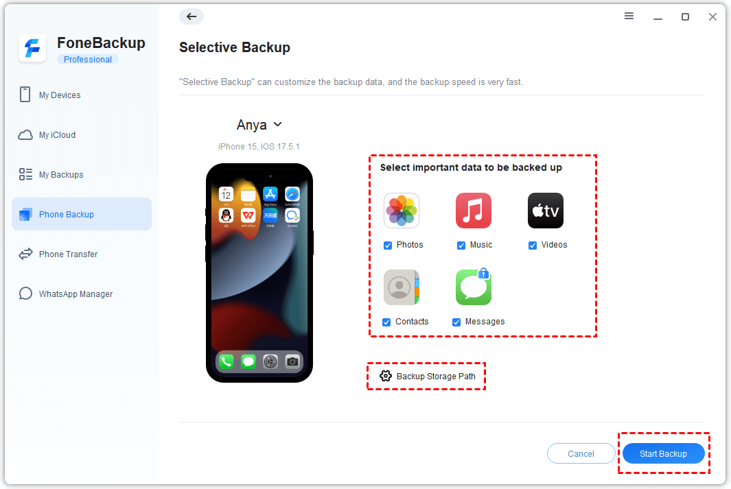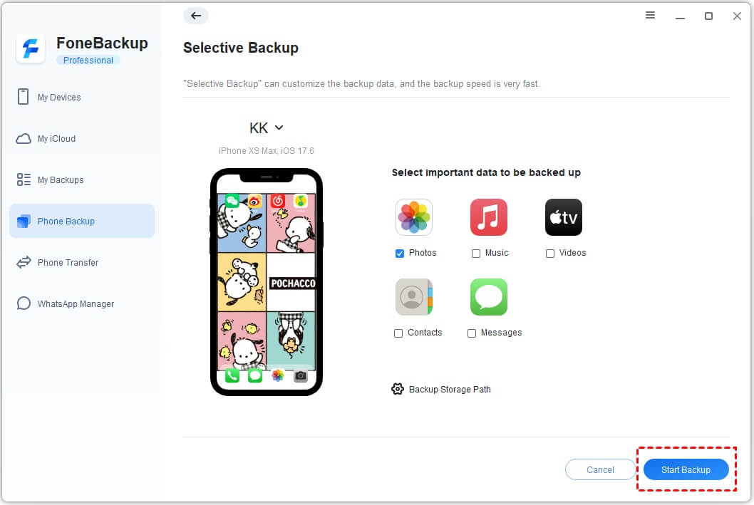 - You can choose to make a selective or full backup to back up your iPhone data.