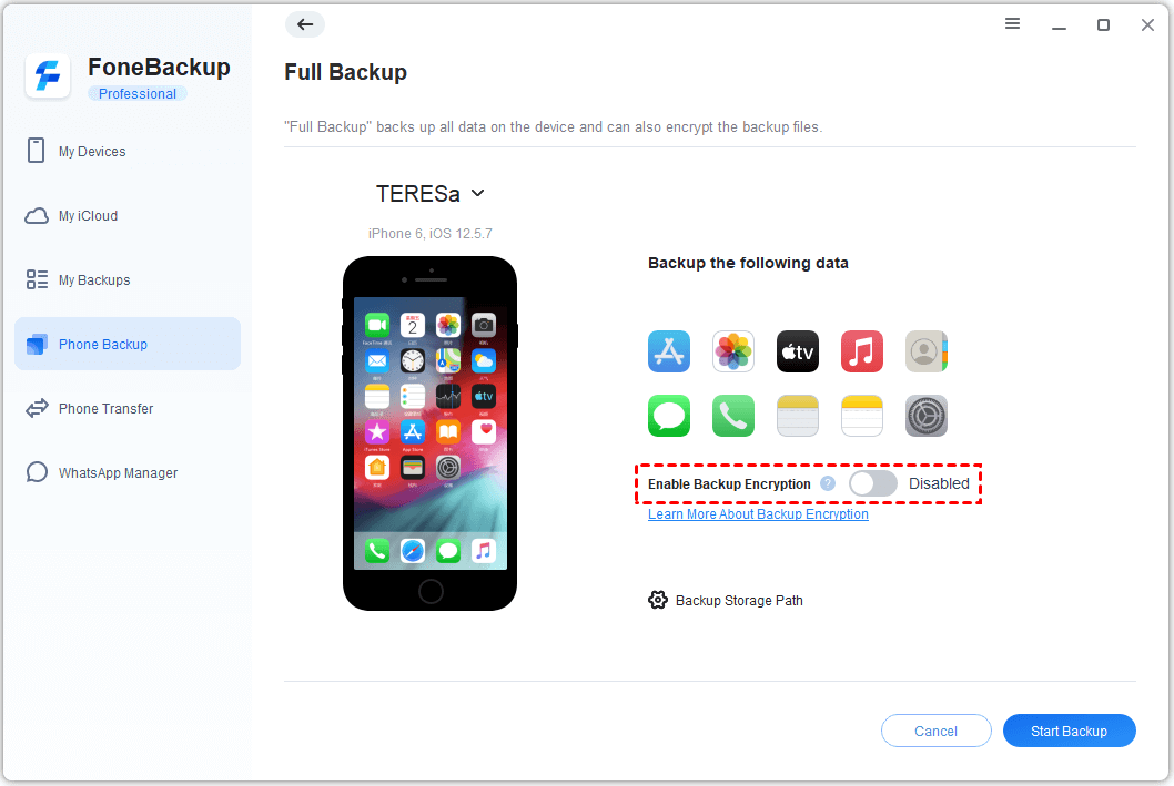 Step 4. Click Start Backup to back up your iphone to external hard drive.