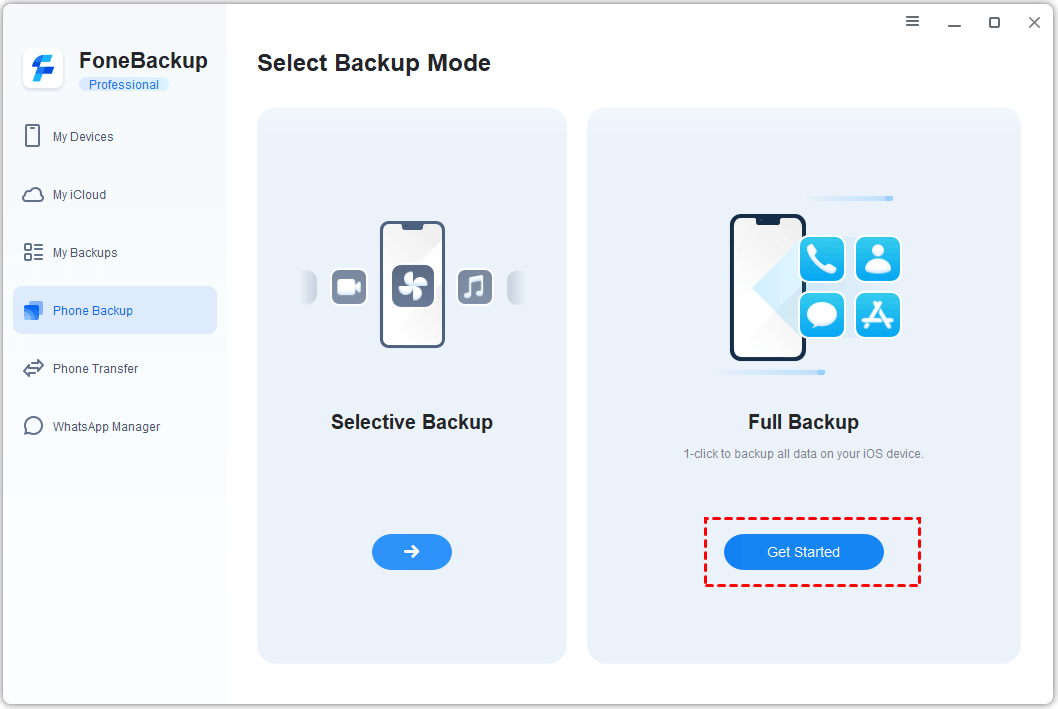 Step 2. Click Phone Backup > Full Backup and click Get Started.