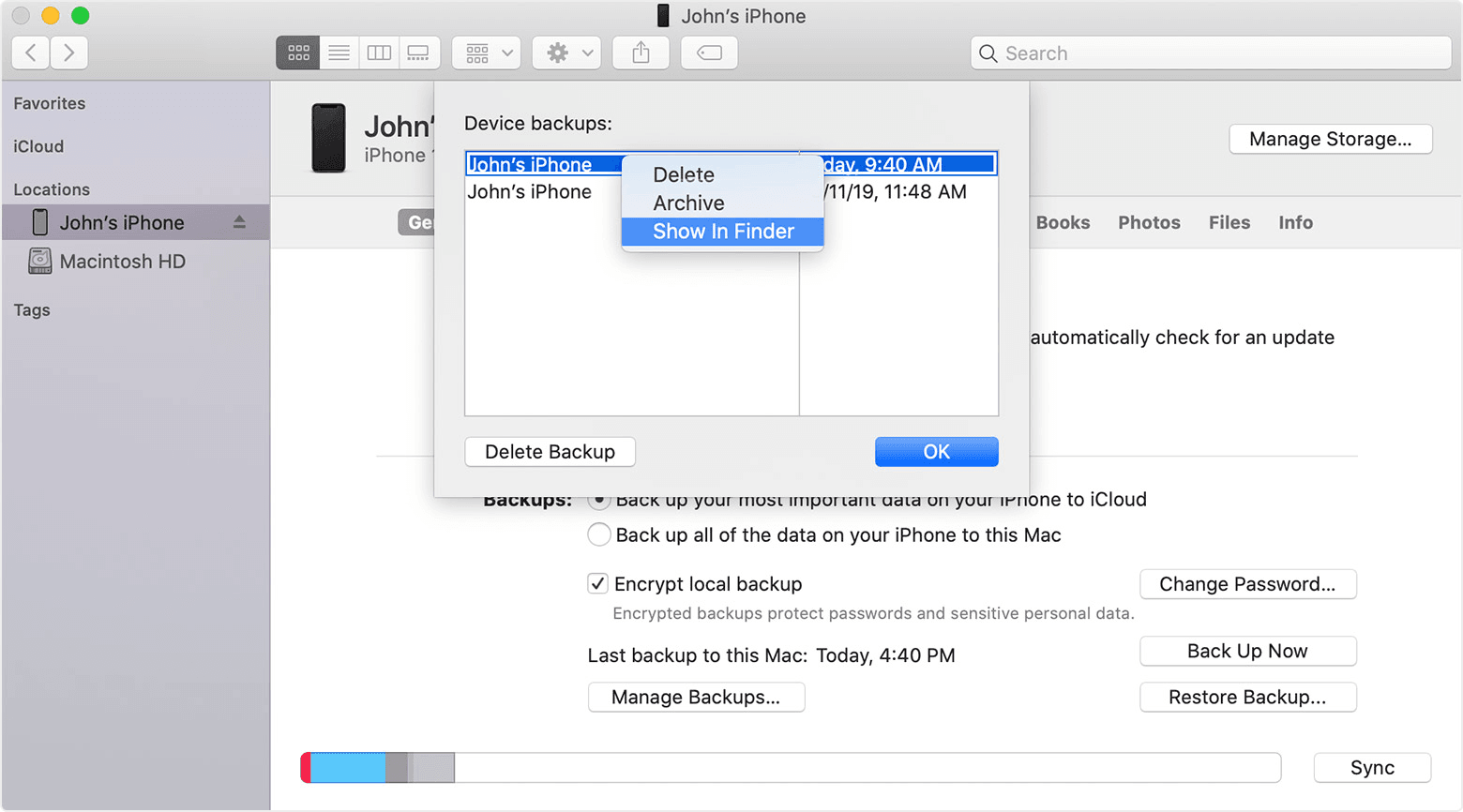 → Find a specific backup: Open iTunes > Click iTunes in the menu bar to choose Preferences> Click Devices > Control-click the backup to choose Show in Finder.