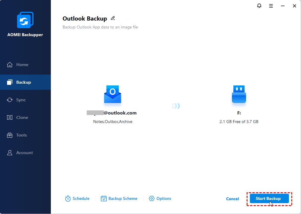 - Add the Outlook account containing emails imported from Outlook Express and close it. Then, open AOMEI Backupper Professional and click Backup and Outlook Backup.