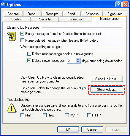 - Then, in the Options window, click on the Maintenance tab and select Store Folder... It will show you the folder location of your Outlook Express data.