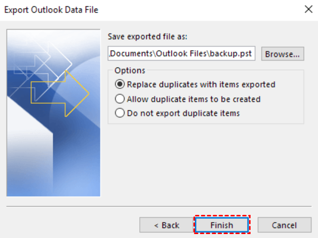 5. The default location for the backup file is C:\Users\Username\Documents\Outlook Files. Or on the other hand click Browse to choose another area. Additionally, give the backup file the name you need. Next, select Finish.
