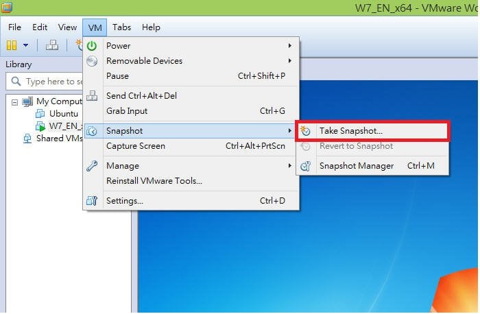 Step 1. In VMware Workstation, choose VM > Snapshot > Take Snapshot.