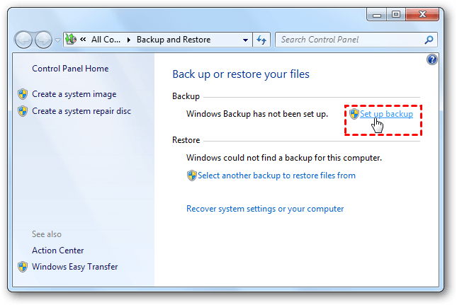 Step 1. On your VM running Windows 7, click Start > Control Panel > Back up your computer under System and Security. Or you can click Start and input "backup and restore" in the Search box. Here you come to the main interface of Backup and Restore. Click Set up backup.