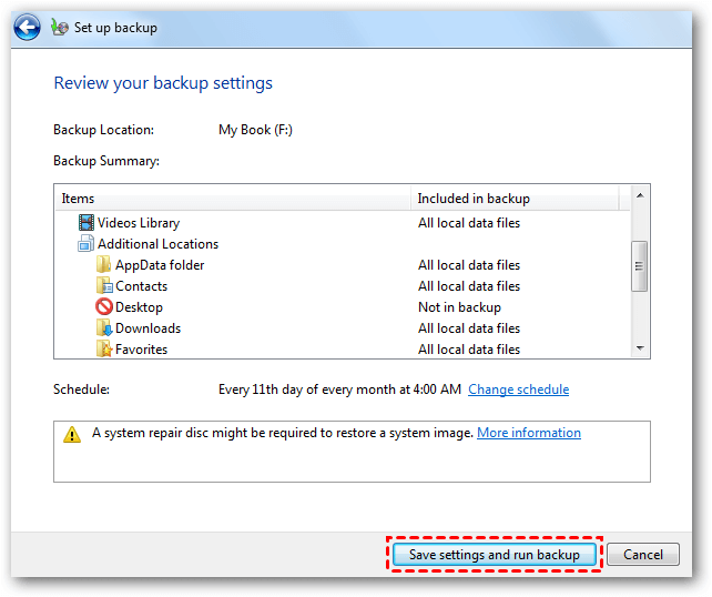 Step 5. Review your backup settings, confirm it and click Save settings and run backup.